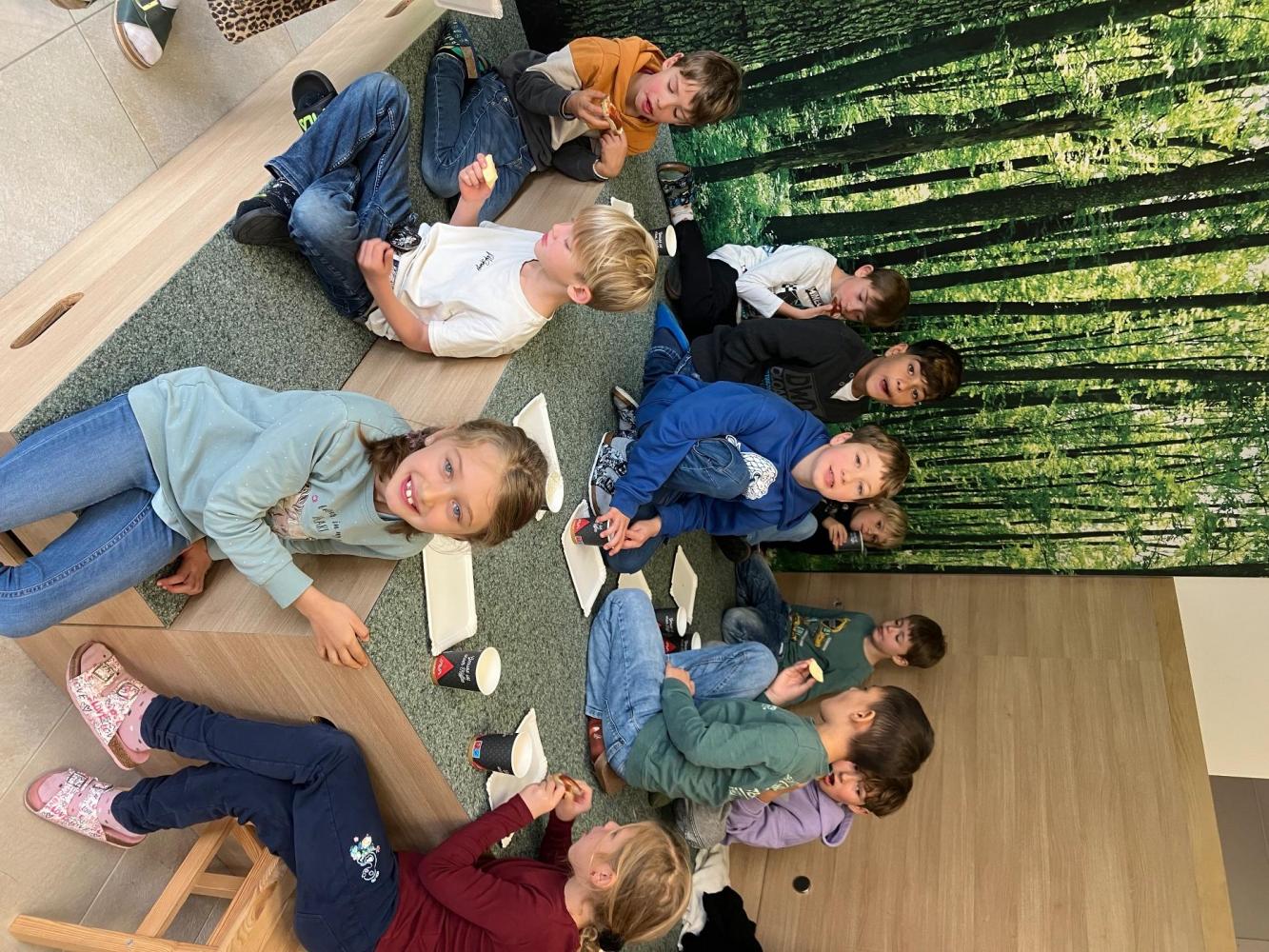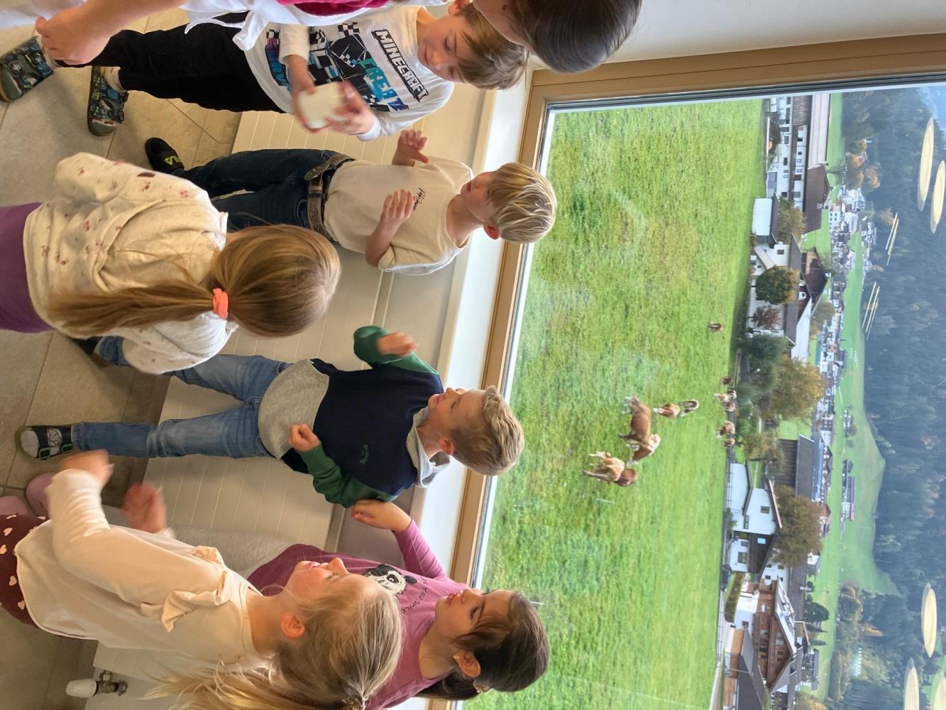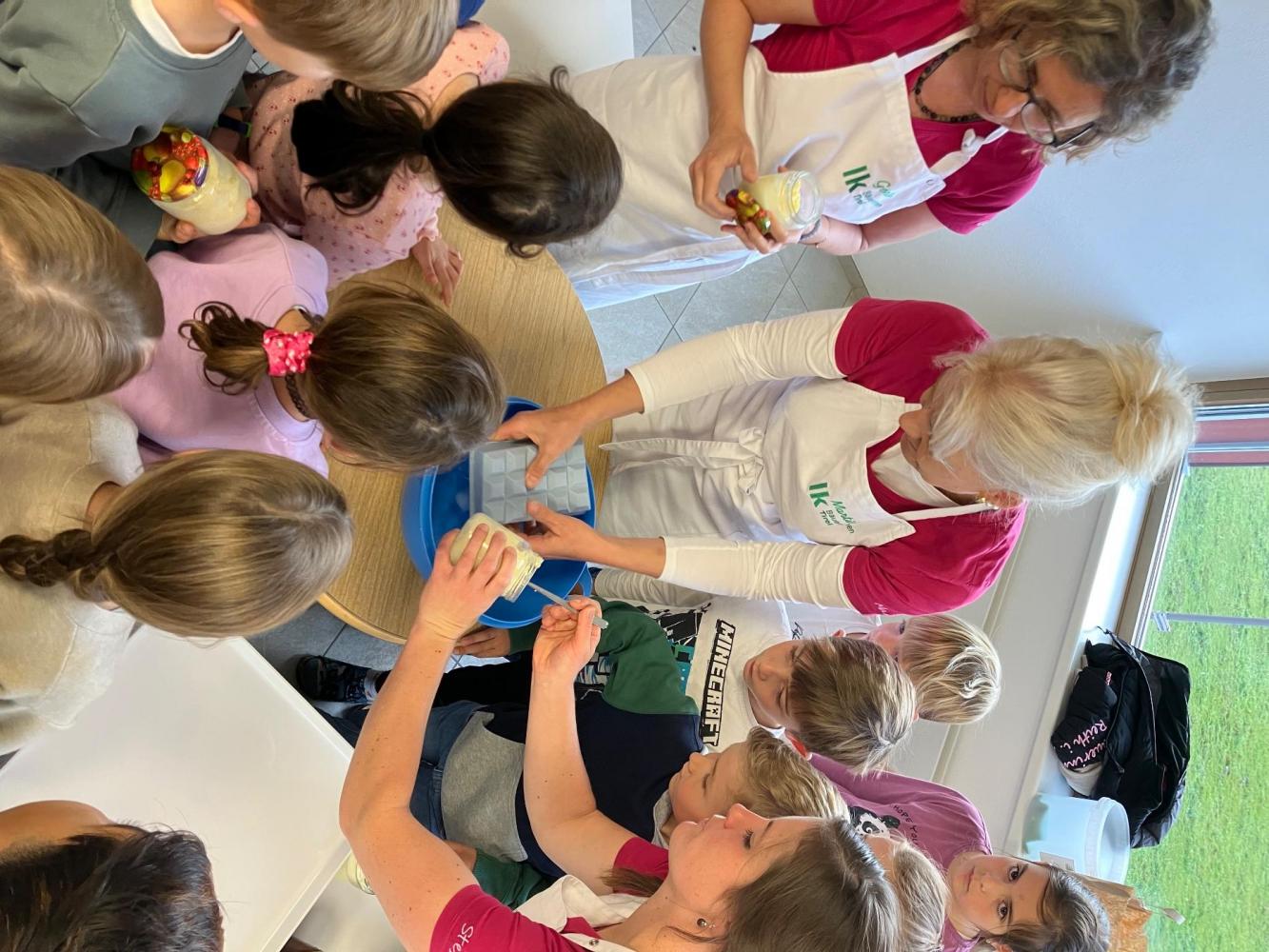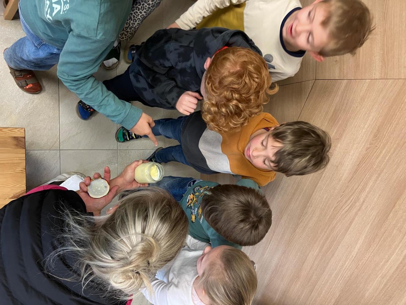 Anschließend durften die Kinder selbst aktiv werden. In kleinen Gruppen wurde eigene Butter hergestellt. Mit Eifer wurde geschüttelt, bis sich schließlich die feste Butter bildete. Zum Abschluss genossen alle eine gemeinsame gesunde Jause.