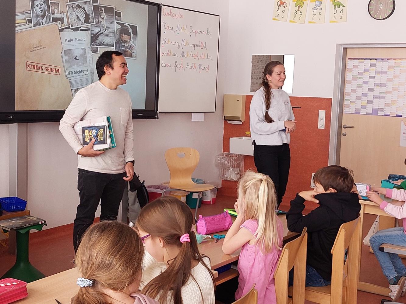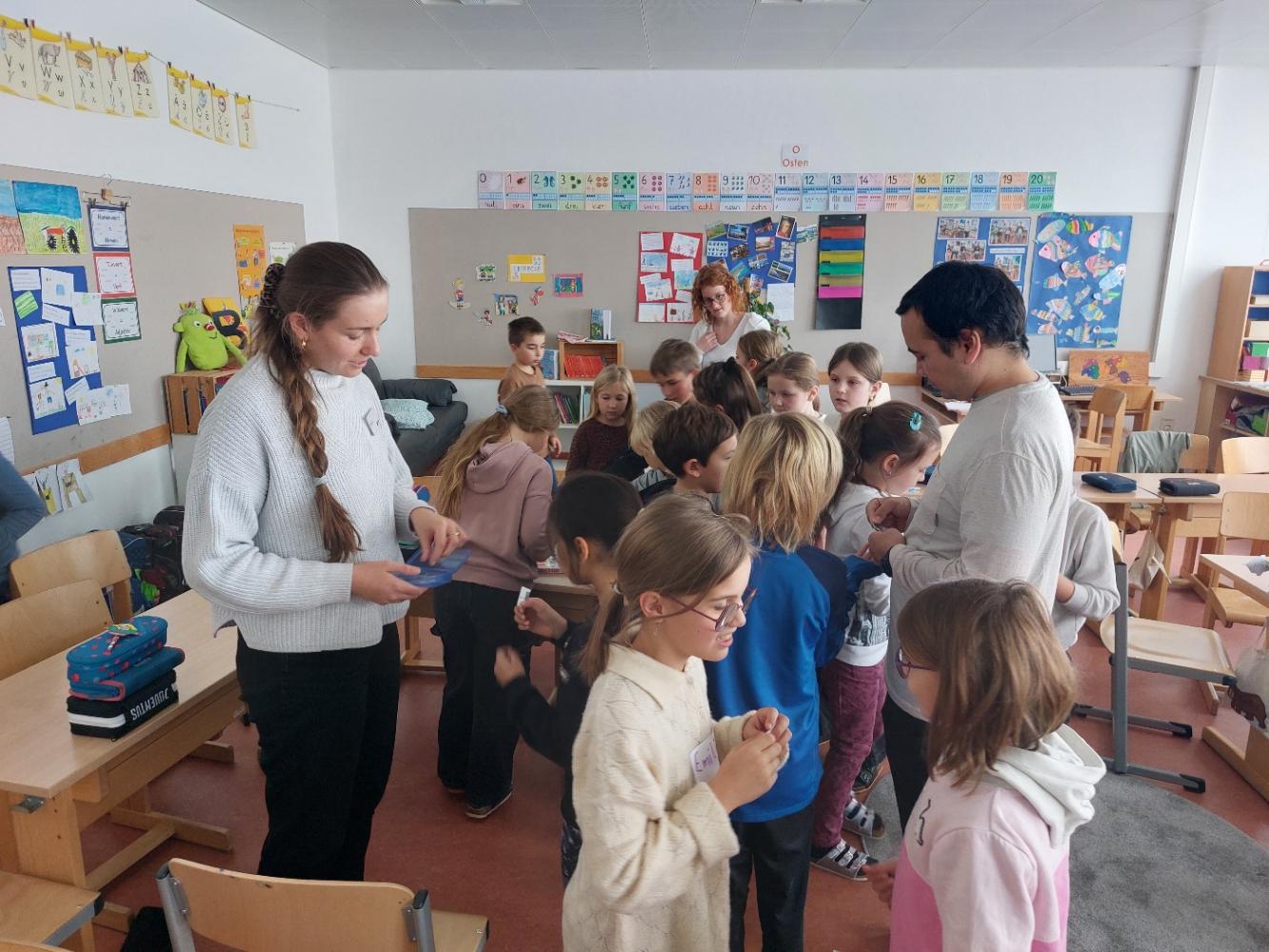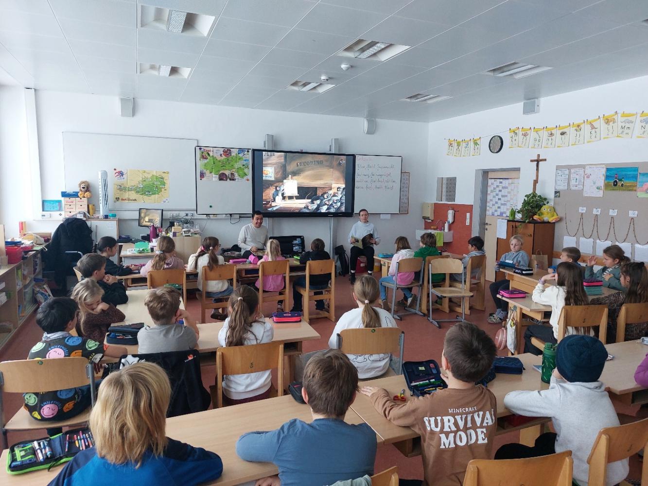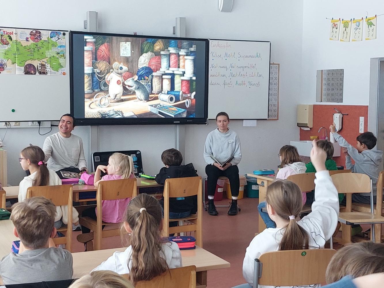 Zwei Mitarbeiter der AK Innsbruck präsentierten das beliebte Bilderbuchkino „Armstrong - Die abenteuerliche Reise einer Maus zum Mond“ und nahmen die teilnehmenden Kinder der 3a und 3b mit auf eine fantasievolle Reise ins All.