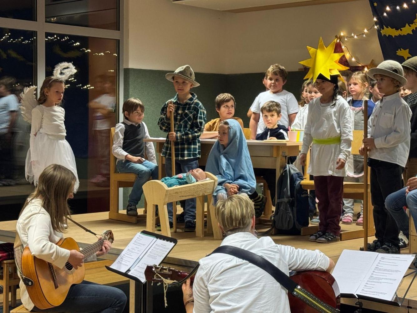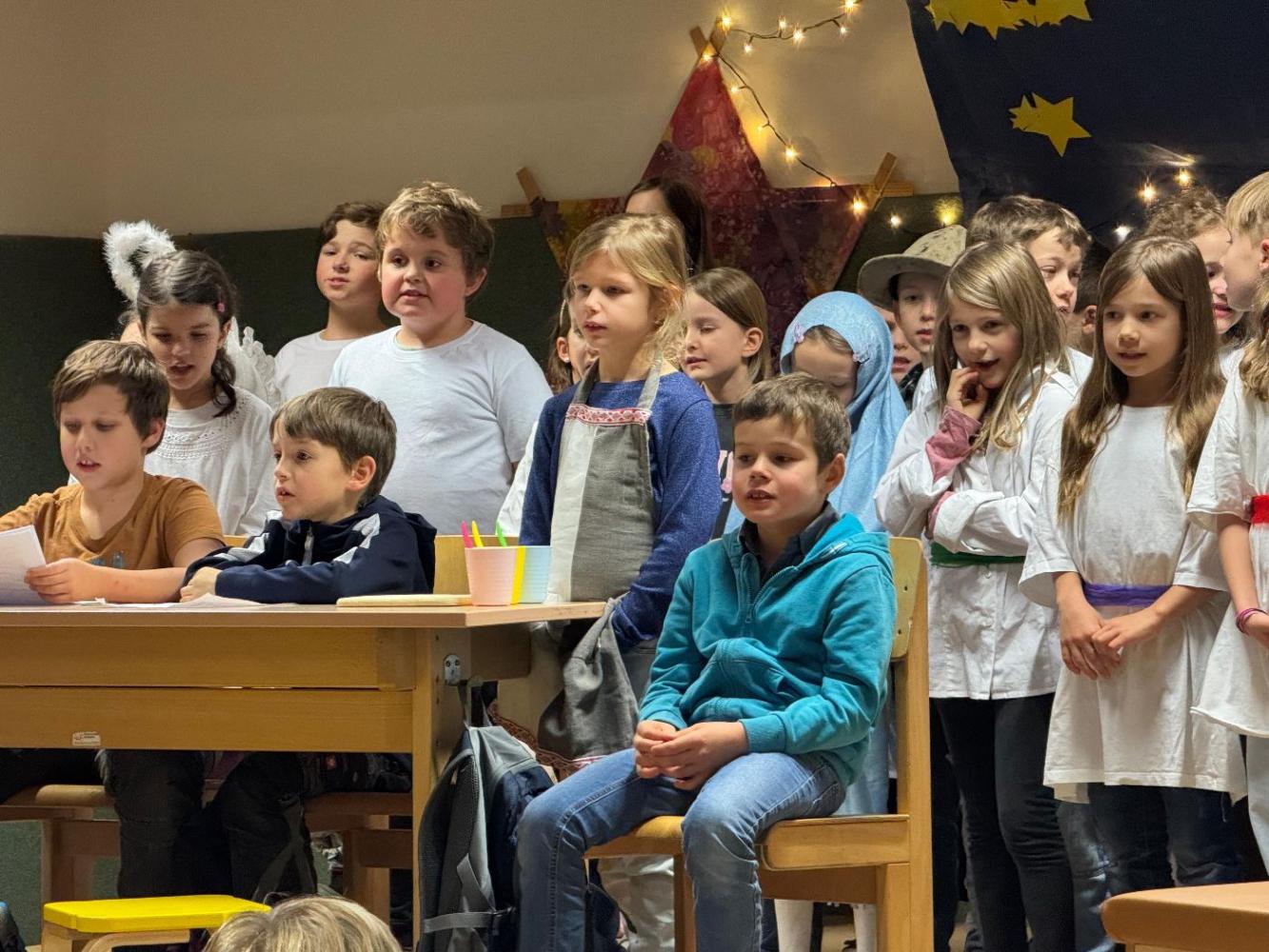 Schon seit 2 Montaten arbeiten Frau Moser und Frau Lederer mit den Kindern der 2. Klassen an einem Weihnachtsmusical. Bei etlichen Proben wurden die Lieder und Texte eingeübt und die Kostüme angepasst - ein Aufwand, der sich mehr als gelohnt hat.